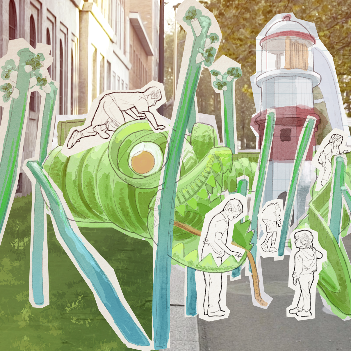 Ecco la riappropriazione di uno dei contro-viali di viale Molise. In un futuro in cui il trasporto con autovetture private sia molto ridotto, questi spazi saranno riutilizzati per la socialita’ e la convivialita’, qui rappresentate da un parco giochi…