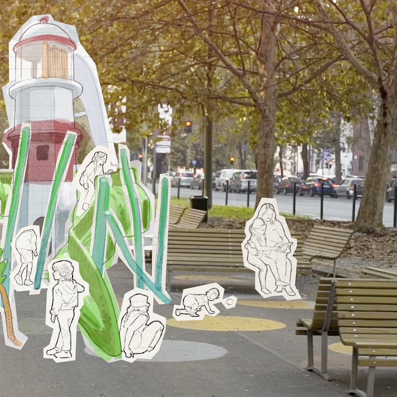 Nel futuro sostenibile del quartiere Molise-Calvairate-Ponti, questo pezzo di strada è stato riconvertito ad area pedonale. Il marciapiede è ora coperto da uno strato d’erba e un po’ dappertutto spuntano pali di legno alle cui estremità sono installati contenitori per la coltivazione idroponica. Al centro della piccola area giochi, poi, è stato costruito un faro a misura di bambino grazie al legno riciclato magari proveniente dai bancali del vicino ortomercato. Lo scivolo che sporge da questa struttura bianca e rossa si avvolge attorno ad un grosso mostro marino, realizzato con i copertoni usati di vecchie autovetture: una creatura che nutre le fantasie dei bambini che spendono interi pomeriggi ad esplorarne le spire. Tutto intorno saltano, giocano, corrono e vivono avventure fantastiche bimbi di tutte le età, ma non solo loro: bancali, copertoni e tutti gli altri materiali di risulta sorgono anch’essi a nuova vita.
